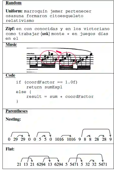 为了探究到底是music和Java code中的什么潜在结构提升了L2的性能呢?作者猜测会不会是其中的层级递归结构呢?但是在music和code上又不好直接验证。于是有了第三组实验来探究层级递归结构对L2的影响。作者伪造了两个括号数据(配对的整数数据),一个具有层级递归结构(Nesting parents),一个没有递归结构但是有配对的标记对的信息(Flat Parens)。可以看到他们俩给L2带来的性能提升几乎持平。那这是不是说明层级递归对L2没有多大用呢?是的,至少这篇文中的实验室设置下是的。但是作者说这也说明标记对的匹配预训练LSTM语言模型是有帮助的。他们甚至表现比用music的还好,你说神奇不神奇。