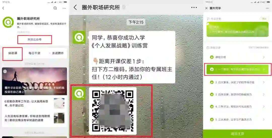 扫码报名后,会自动跳转到圈外公众号,点击“关注公众号”后,会自动弹出班主任二维码,扫码添加,即可等待班主任拉群。请及时添加班班微信,确保成功进群。