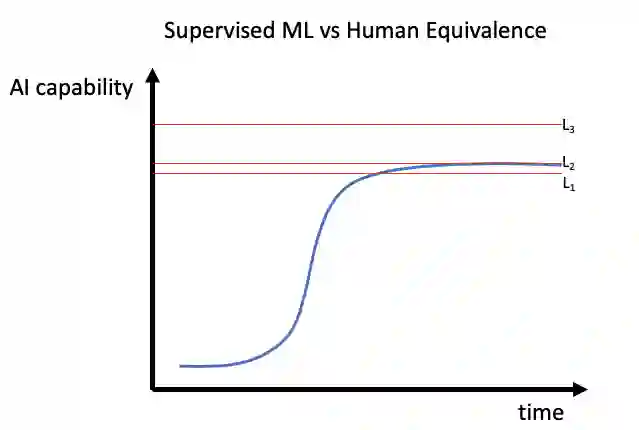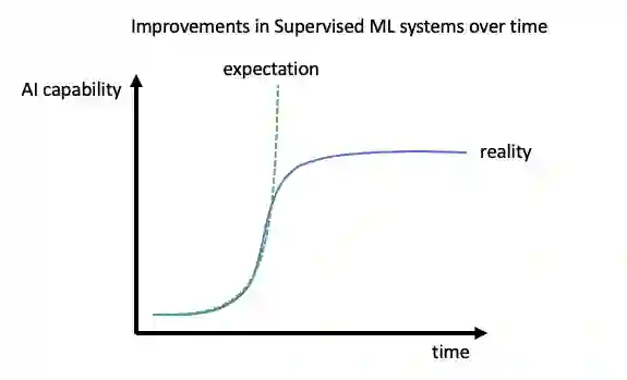 众所周知,构建 AI 无人驾驶方案的最大挑战,在于处理各类不太常见的情况,也就是所谓极端条件。实际上,模型本身的质量越高,寻找全新极端案例数据集的难度就越大。另外,模型质量越高,改进所需的数据就得越准确。因此,人们意识到 AI 性能质量并不能保持指数级增长(即摩尔定律),反倒是 AI 系统的改进成本在呈指数级增长。从这个角度出发,有监督机器学习似乎必然不可持续(下图中的 S 形曲线)。