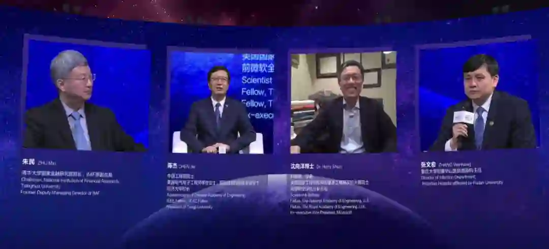 :清华大学国家金融研究院院长朱民、中国工程院院士陈杰、清华大学教授沈向洋、复旦大学附属华山医院感染科主任张文宏
