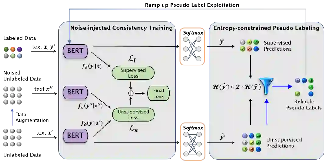 我们提出熵约束的自动伪标签筛选机制,用有监督输出结果的熵来约束无监督输出结果的熵,并选择低熵样本作为高置信度的伪标签数据。具体而言,在每一训练时刻,有监督部分的模型预测值与无监督部分的模型预测值,通过 Softmax 归一化后,输出结果的熵分别为:
