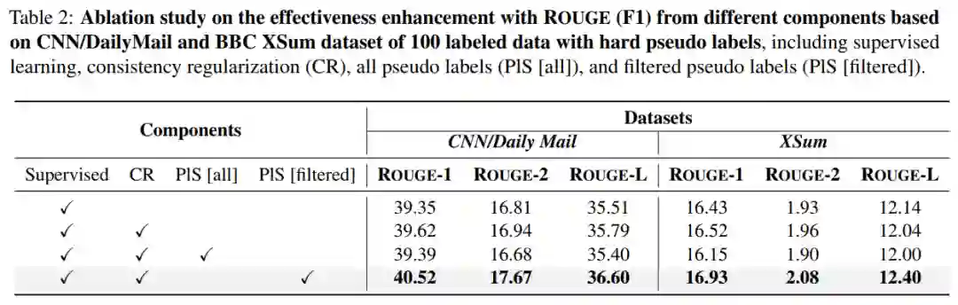 1. 所有的数据集规模下都实现了显著的性能提升,相比于纯有监督训练,当有监督数据量为 100 时,效果尤为显著,在 ROUGE-1, ROUGE-2 和 ROUGE-L 这三个指标上分别实现了 1.17、0.86 和 1.09 个点的性能提升。
