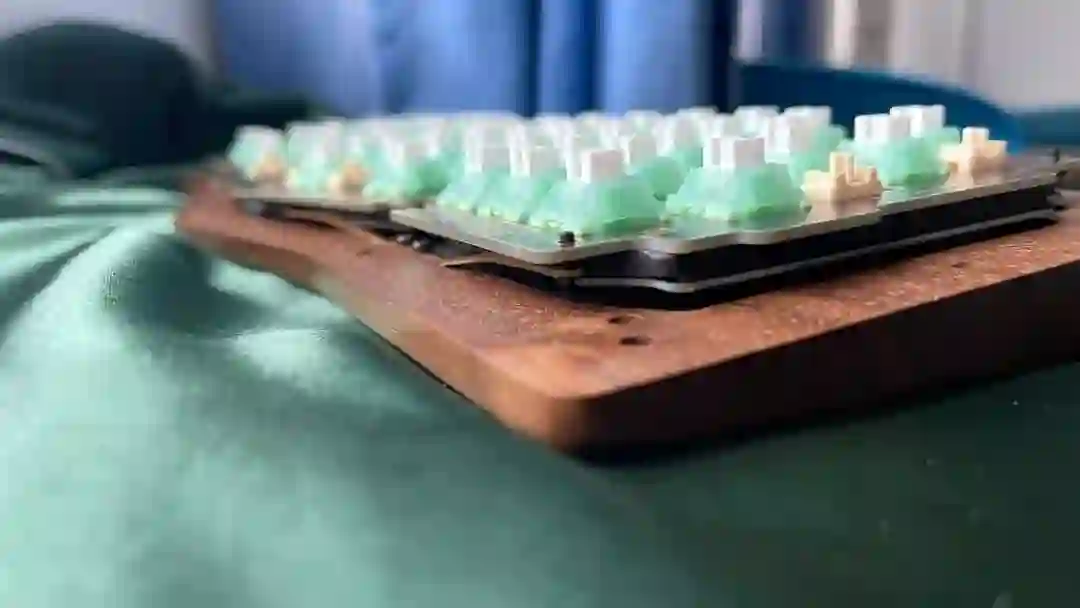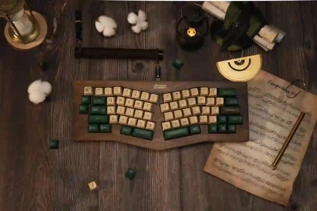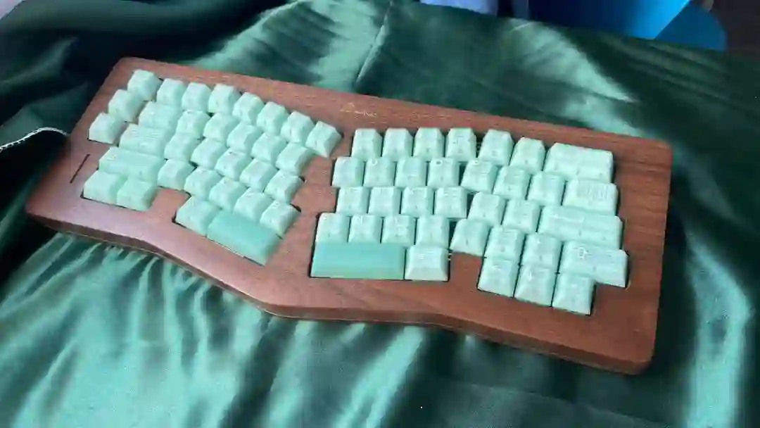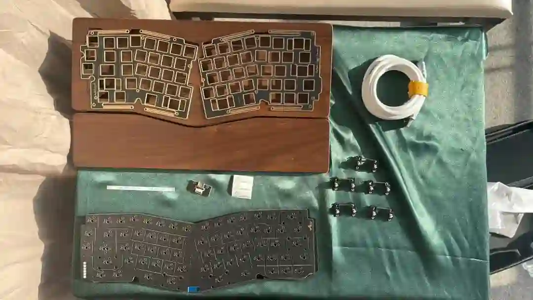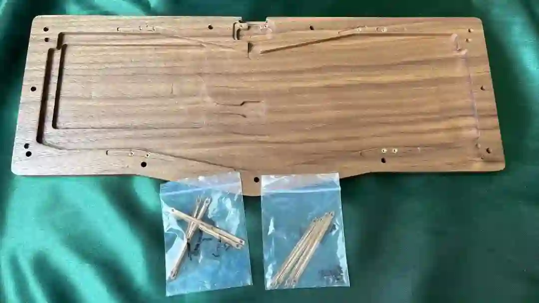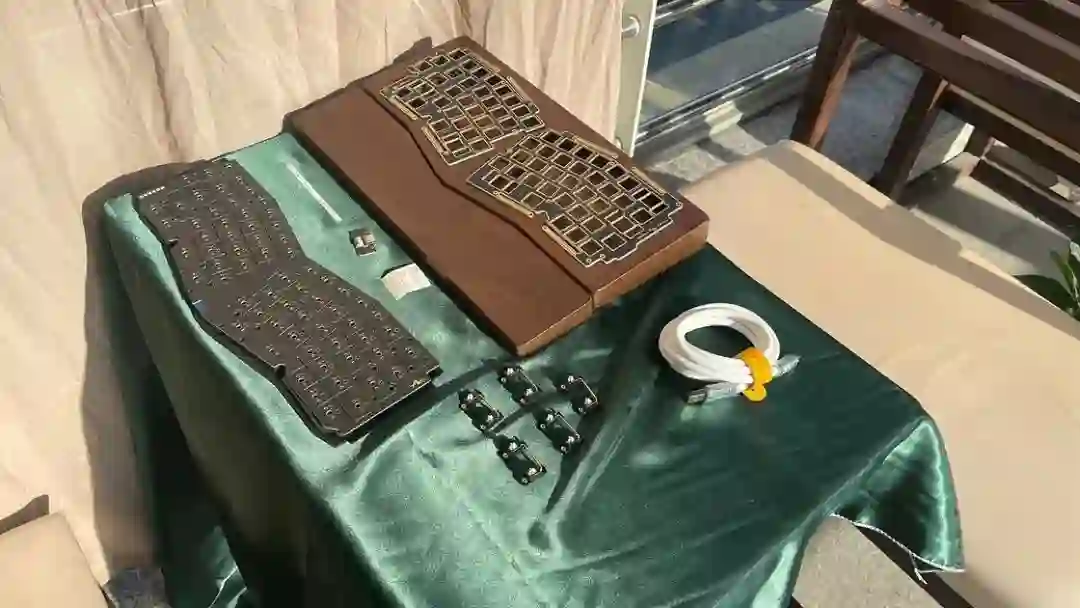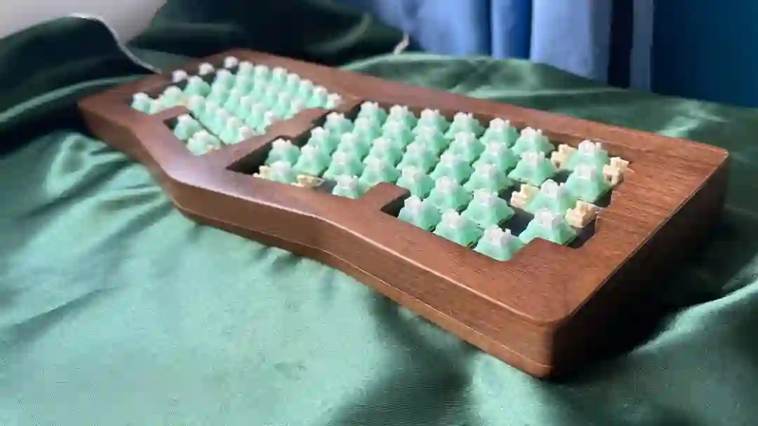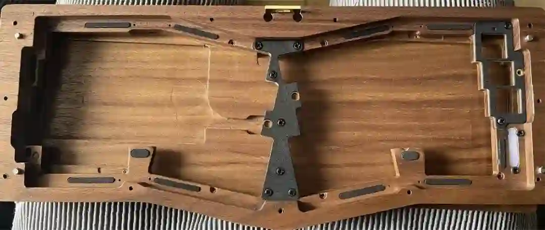 ▍前言键盘的配列布局,无奇不有,键盘圈子里总是有你想不到的,但没有做不到的。从早些年的全配列独占鳌头到 98% 配列的大火、65% 的井喷,谁更受欢迎,莫衷一是。作为一个键盘爱好者,我对于那些奇奇怪怪的键盘配列甚是钟爱,然而,如果要说这些年里哪种不那么主流的键盘配列成为了真正的现象级,那 Alice 配列绝对是当仁不让。它的上手门槛相对较低,因此社区里也频繁推出新品。在过去几年中,我也收集把玩了不少 Alice 键盘。不过,若是一般的公模 Alice 套件,也无太多可讲之处。但今天要简评的 AMX60,确实是有点意思,它是由一家专注木质键盘的工作室——匠人学院开团制作,是一款木质外壳的 Alice 键盘。团购后等了足足半年,它才终于到达我的手中。键盘本身可选 top 和 leaf-spring mount 结构,也可无铍铜缓冲片安装。来自 GB 帖▍开箱包装方面,AMX60 直接将套件本体和配件放入了定制的收纳包内,用合页隔离。不过不同于传统的收纳包,这次包体内部对 Alice 外形有适配定制,值得好评。不过像是 Alice 配列的键盘,基本超过 65% 我就不会考虑外出携带了,因为 Alice 分裂布局使得 65% 占地面积直逼 80%,外出携带方面我可能会更倾向于传统 65% 和矮轴键盘。配件方面,除开外壳和内胆,这次还额外赠送了老周自己开模的卫星轴和航插线以及与外壳匹配的木质手托。定位板则是 FR4 材质,高弹有腿设计,既适配 Spring 的铍铜结构,也能直接适配上下盖安装。▍外壳外壳材质选用了北美黑胡桃木实木,不过我自己对于木材没有多少了解,对此也难有合理的判断,懂行的朋友可以在评论区里分享你的看法。如果从机加工角度来看的话,相较于传统键盘,Alice 键盘的加工难度要更高。同时,木质键盘的加工相较于传统铝合金材质确实是要更加小众和困难。设计语言方面,正面除了左下角一个灯条以外没有其他设计,附赠的三枚 logo 贴纸可以自行进行装饰,不过木质的键盘本身也无需过多的装饰,所以我仅在正上方贴了一枚作为点缀。外壳边缘进行了一定的打磨处理,使其变得圆滑不割手。上下盖接缝设计,不过我个人还是更喜欢天包地或者微微露出底壳的设计。底壳并没有采用隐藏螺丝的设计,自带脚垫,并且额外添加了四颗脚垫备用,以确保安装完成后底部保持平整。▍内胆内胆方面我选择了 AMX60 的双模 PCB 搭配 Owlab 为 Spring 制作的铍铜弹片,组成 leaf-spring mount 结构,默认定位板为开槽 FR4,标配的 EVA 轴上垫、IXPE 夹心棉、轴下垫、底棉。全键热插拔,同时支持阶梯 Caps 这点值得好评。再看内部:上盖部分,由于木质本身有收缩的特性,而 Alice 配列又形状不规则,收缩后的比例控制给加工提出了不小的挑战,尤其是左上角的三颗功能键键位,断裂风险较大。所以它加入了固定板,不过介于 Alice 配列的特殊性,必须在加工到一半时让数控停下来,安装好固定板,再进行左三键的加工,以避免左三键处断裂。底壳部分则是预留出了电池槽位和铍铜安装位置▍组装方案