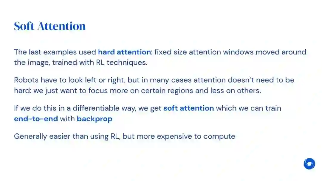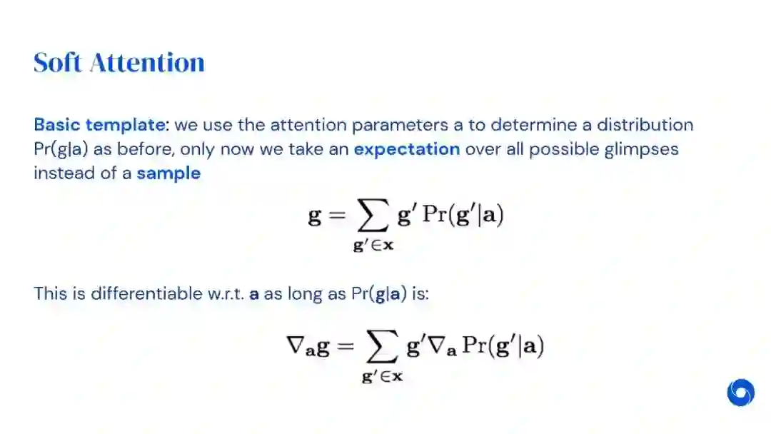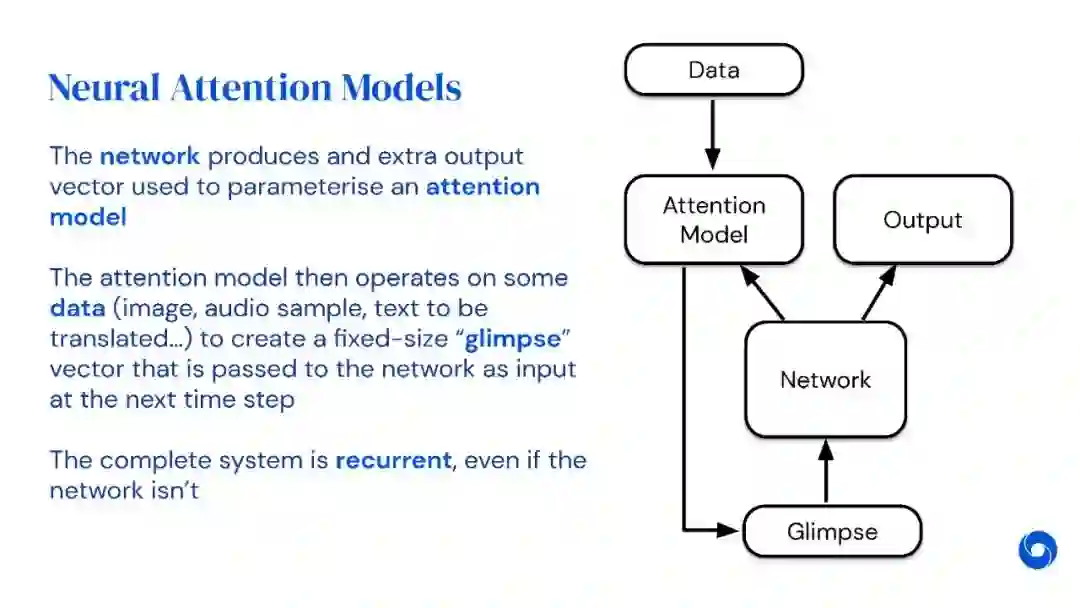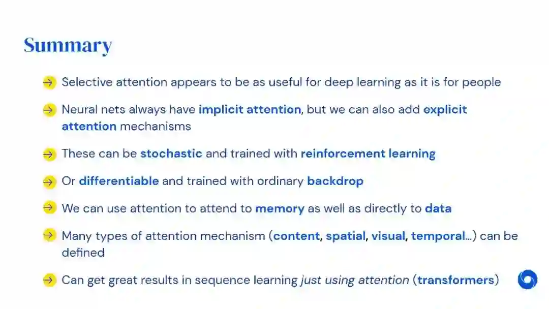在过去几年里,注意力和记忆已经成为深度学习的两个重要的新组成部分。本讲座由DeepMind研究科学家Alex Graves讲授现在广泛使用的注意力机制,包括任何深度网络中的内隐注意力,以及离散和可区分的变体的显性注意力。然后讨论了具有外部记忆的网络,并解释了注意力是如何为他们提供选择性回忆的。它简要地回顾了Transformer,一种特别成功的注意力网络类型,最后看可变计算时间,这可以被视为一种形式的“注意力集中”。