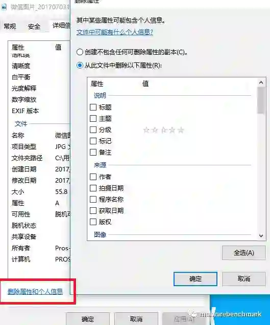 那么从手机拍摄的照片通过 QQ 或微信,转至其它手机,再上传网络会不会还有Exif信息!? 当然还有,除非过分压缩、截图等处理后可以去除。最简单的去除方法是单击右键,选择查看文件详细信息,在点击“删除属性和个人信息”,如图。