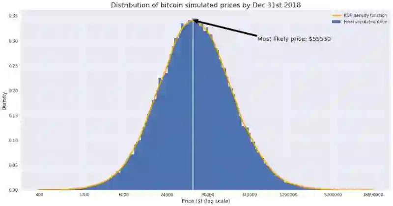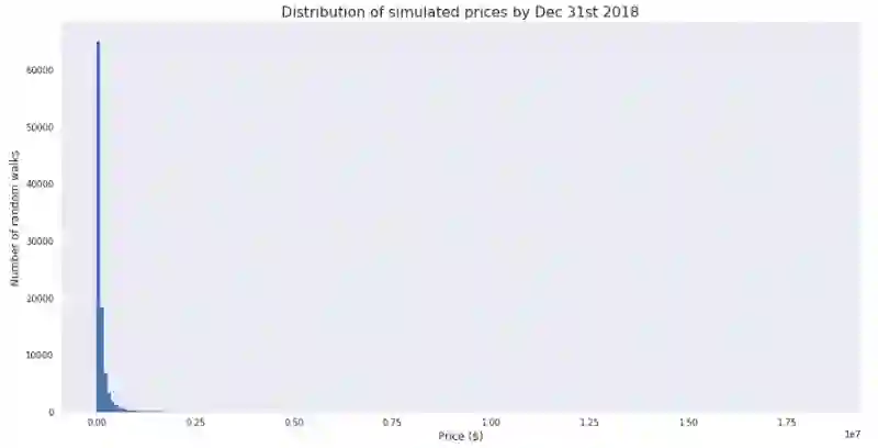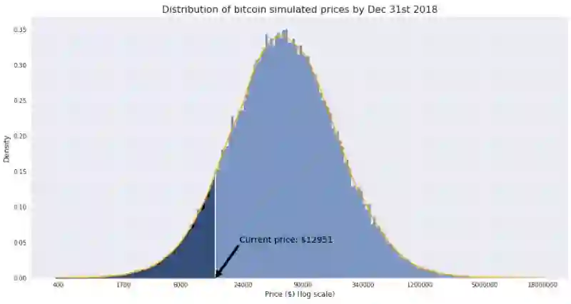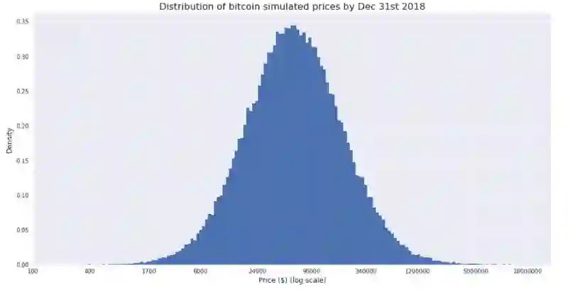 为了在模拟过程中构建每一个随机游走,我们对2010年至今的每日收益数据进行随机抽样,对每个样本加上1,并且累积到2018年12月31日。然后,将当前比特币的价格乘以随机游走的价值来获得模拟的比特币未来价格。这样会重复做很多次(在这种情况下是10万次),到今年年底,我们将看到每个随机游走的最终价格分布。