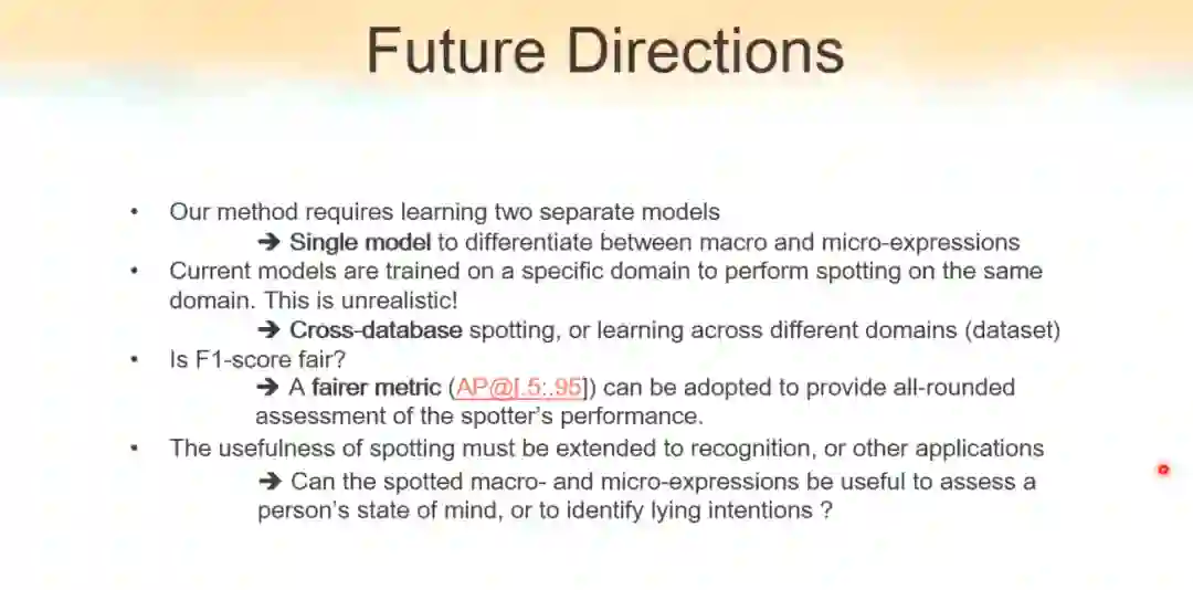 在报告的最后,John提出了他对于微表情检测的一些见解和思考,包括针对宏表情和微表情的单个模型的研究、跨数据库研究的必要性、更合理的微表情检测衡量指标的探索、以及未来与识别等应用的结合等。