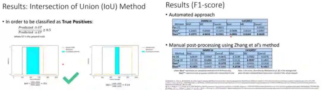 在结果评估的部分,Chuin Hong介绍了目前几届微表情检测挑战赛常用的通过IOU来确定TP的评估方法,并且其初期的实验结果被作为ACM Multimedia-FME2021微表情挑战赛检测任务的基线结果。在实验中,Chuin Hong还对常见的固定k长度区间和手工选择连续帧两种方法进行了比较。