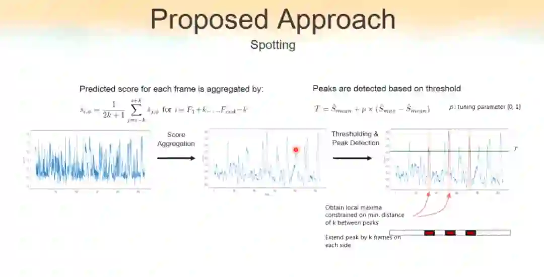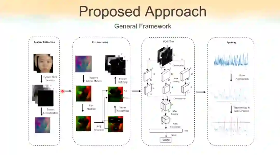 在微表情检测的部分,通过比较特定区间内帧之间的预测分数,并且在滤波之后,设定阈值,得到最终的检测结果。