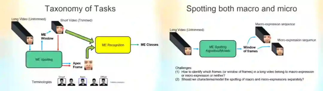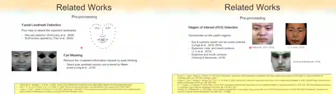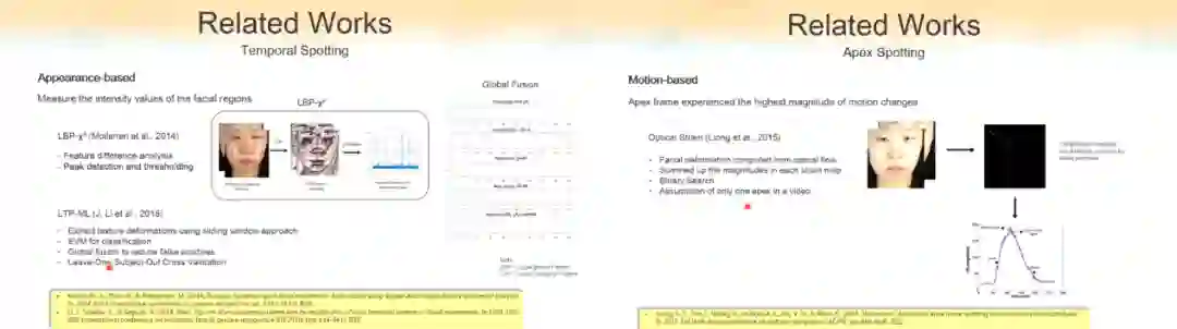 在相关工作的部分,John根据常见的方法流程,从预处理(人脸特征点检测+眼部遮挡+兴趣区域的选择)、到基于区间的微表情检测(主要介绍了基于外表的特征提取)和基于峰值帧的微表情检测(主要介绍了基于动作-光流的特征提取)。并且对两个同时包含微表情和宏表情的长视频数据库:CAS(ME)2和SAMM-LV进行了简要介绍。