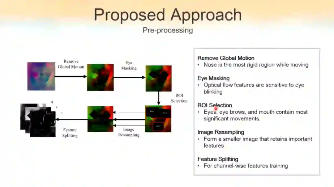 然后,在特征预处理的阶段,通过与人脸最固定的区域-鼻子进行比较去除脸部的全局运动;并对眼睛进行遮挡,去除眨眼带来的影响;选择和微表情相关的兴趣区域。在通过图像重采样和特征分离,得到最终输入到网络的特征。