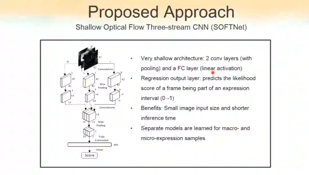 之后,将处理后的特征输入到一个浅层的神经网络,最后的输出层为一个回归输出,预测该输入帧为表情的概率。宏表情和微表情的网络是分别训练的。