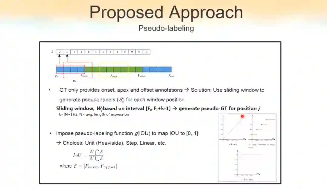 接下来,John主要介绍了一个假标注(Pseudo-labeling)的操作。由于微表情的标注一般包括起始帧、峰值帧和终止帧,John认为微表情在起始帧这一刻不是突然开始的,通过Pseudo-labeling,对起始帧的前几帧进行一个重叠区域的判别,扩充微表情区间的标注。