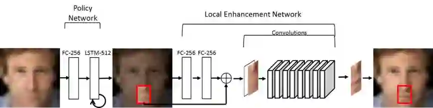局部增强网络则同样将之前的增强结果使用两层全连接层进行编码,然后通过另一层全连接层缩放至和选择区域同样大小的特征图,并和图像区域合并在一起,经过卷积神经网络得到增强的图像区域,放回到输入图像中。