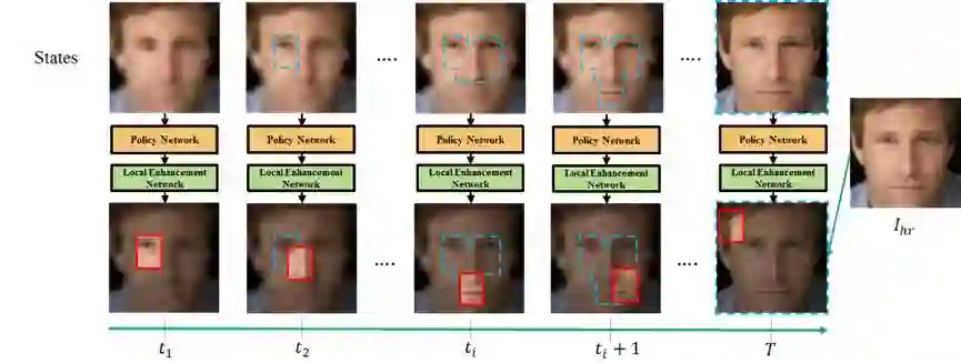 在每一步,输入之前的全图增强结果,使用策略网络选取全图的一块区域,并通过局部增强网络进行图像增强,增强的结果将拷贝并覆盖至原图,并作为下一步的输入。重复该步骤T次,得到最终的复原结果。