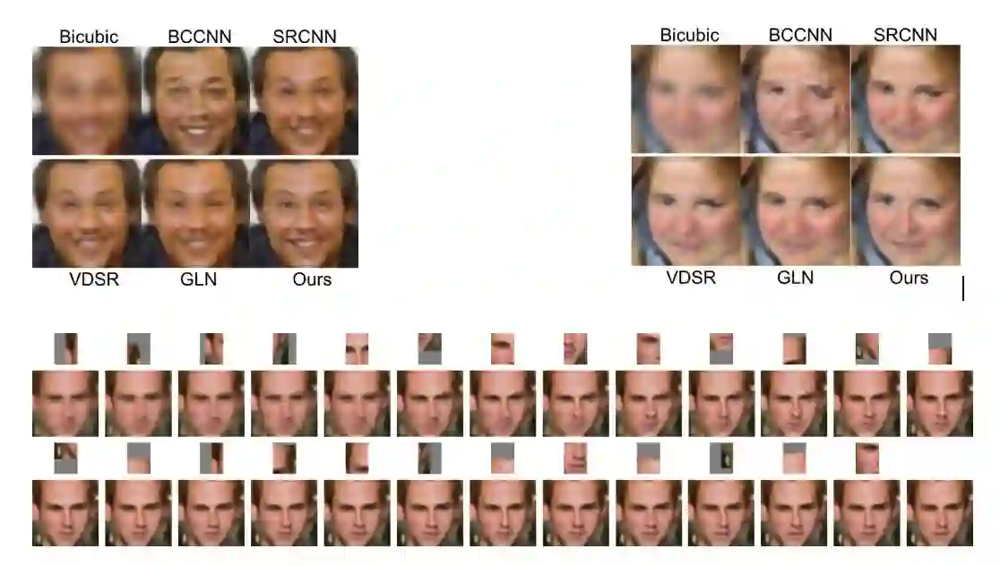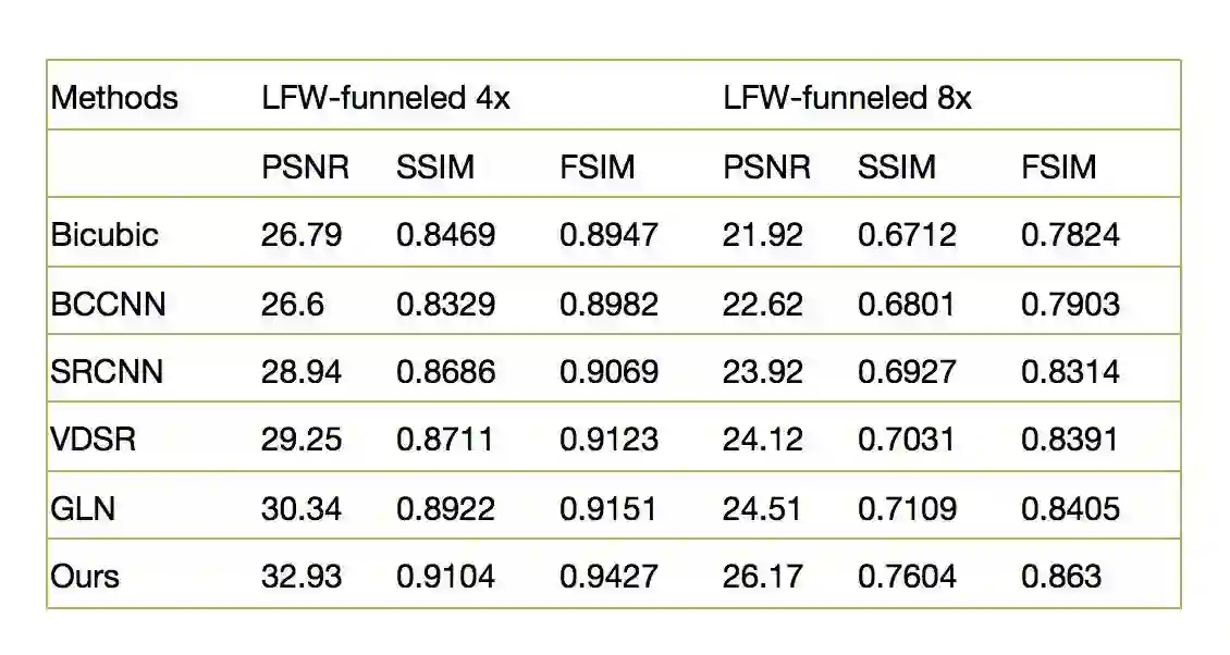 我们在LFW和BioID数据集上测试了8倍降采样和4倍降采样人脸图像的恢复效果,相比于之前的方法有了较大的提高: