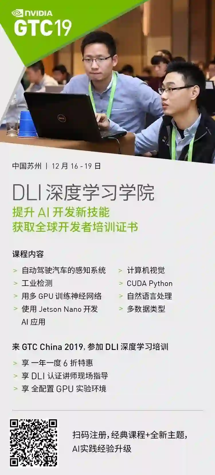 今年 12 月 16-19 日,在 GTC CHINA 2019 在苏州金鸡湖国际会议中心举办期间,NVIDIA 将于 12 月 17 日推出《深度学习基础 — 用多 GPU 训练神经网络》DLI 培训,旨在帮助开发者们应对大规模训练的算法和工程挑战。