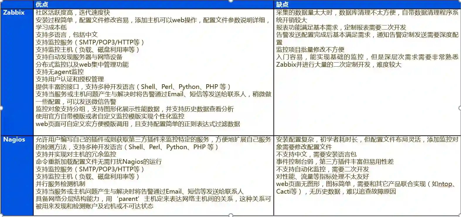 当然,市面上还有诸如:Open-Falcon、Zenoss、Ganglia、Prometheus、Cacti等开源产品,简单分析如下: