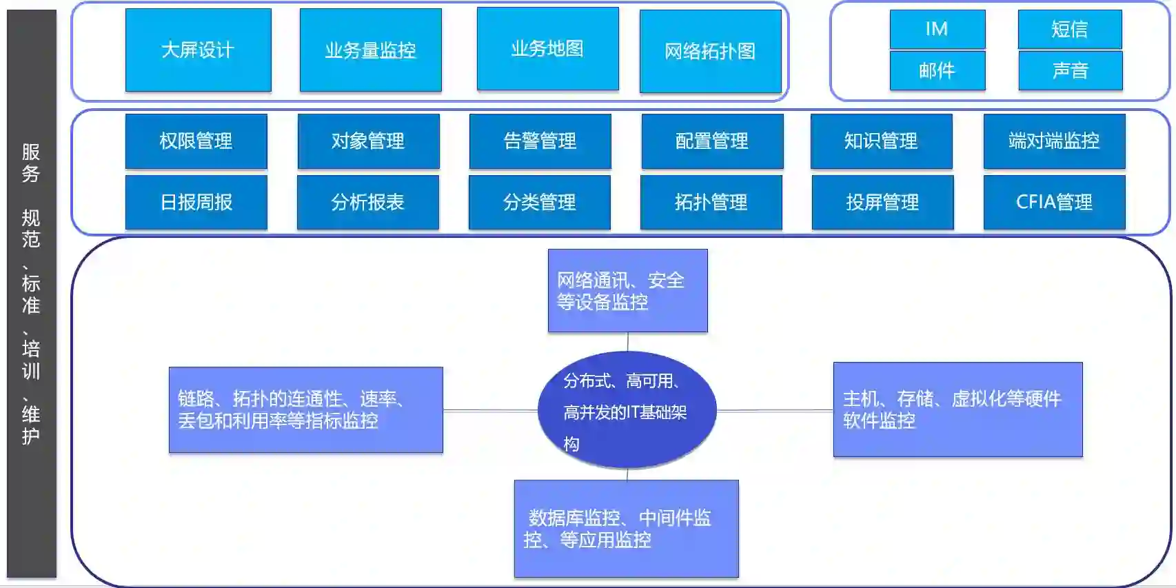 其它运维工具:ITSM(也可能是独立的工单系统、服务台系统、CMDB或资产管理系统)、动环管理系统、APM系统、DevOps系统、自动化运维工具平台、日志平台、端对端拨测系统、安全系统、4A系统、审计系统私有云平台等。
