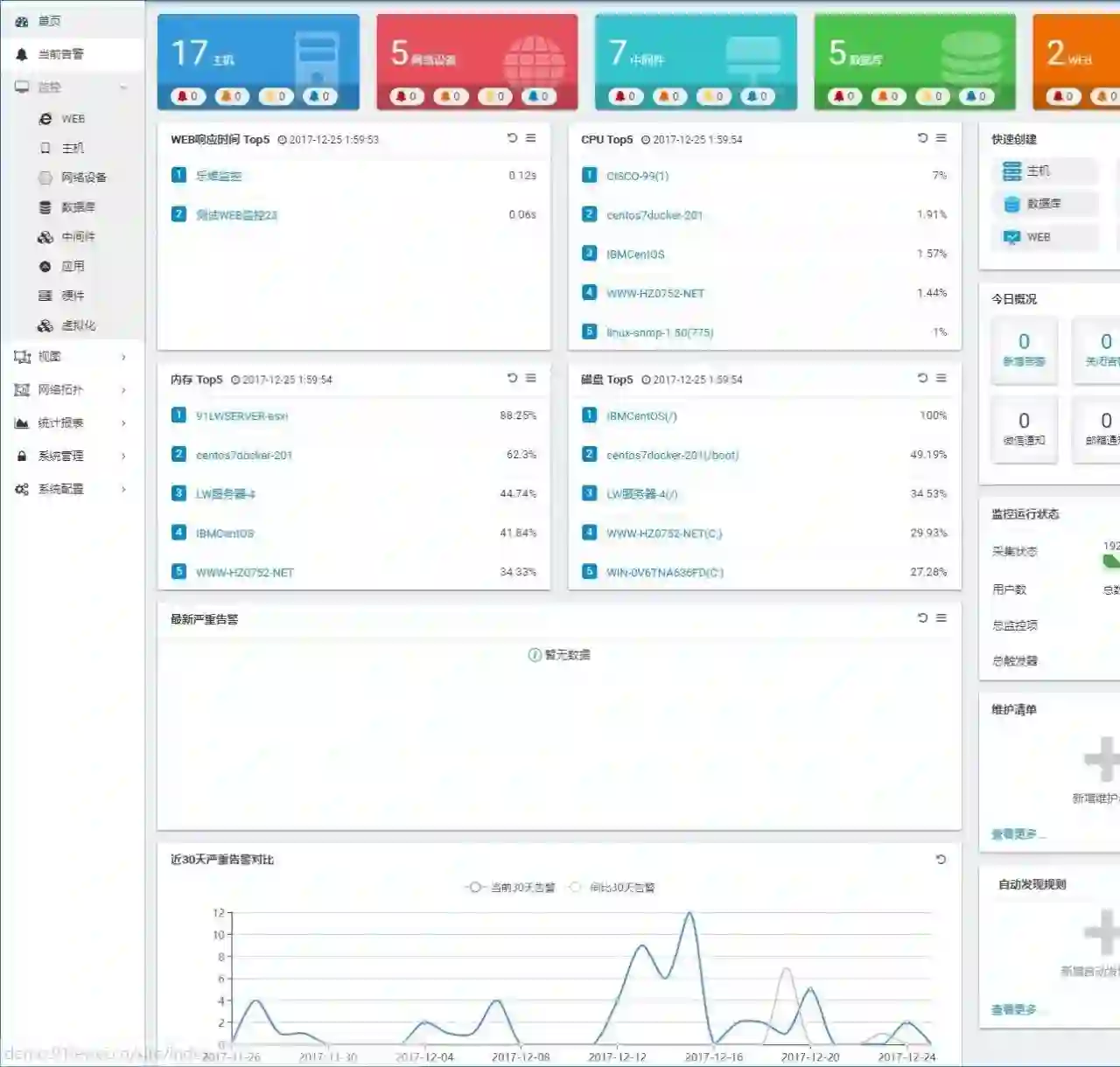 高可用部署:高可用部署依赖可预见的监控规模和组织,对监控系统的重视程度渐次加强,最简单的起码做到Web和DB的分离;其次,做到数据库层面的高可用;然后是分布式代理,甚至代理层的高可用;再是考虑Web层的负载,最后,有条件的可以加一层冷备。