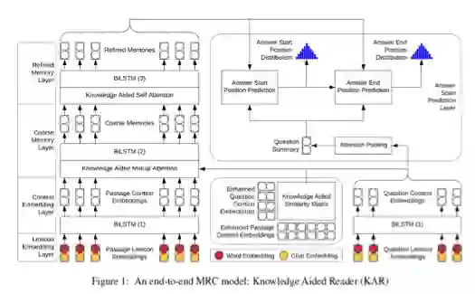 (2)作者提出了一个名为知识辅助阅读器(KAR)的端到端MRC模型,该模型使用提取到的常识来辅助其注意机制,增强模型的阅读理解能力,削弱噪声的影响。实验证明了模型的先进性。