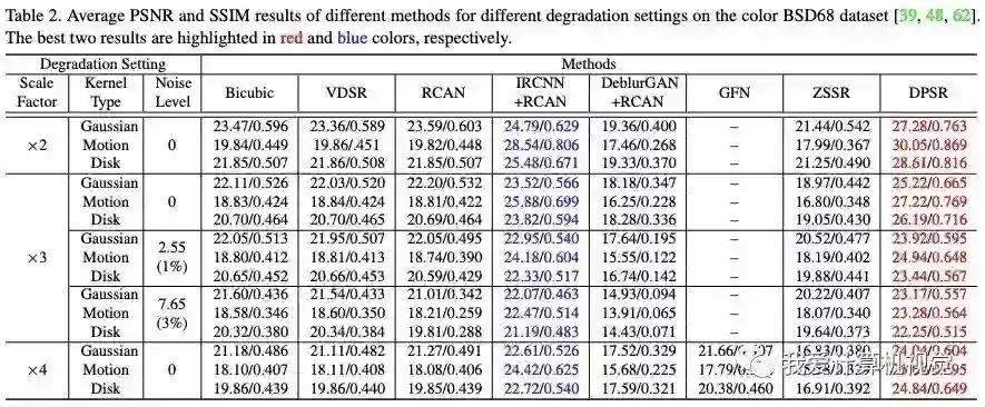 在BSD68数据集上,使用常用的PSNR和SSIM图像质量评价方法,DPSR取得了毫无争议的最好结果。如下图所示: