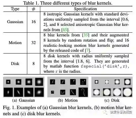 作者们研究了如下模糊核,包括高斯模糊、运动模糊、Disk模糊。