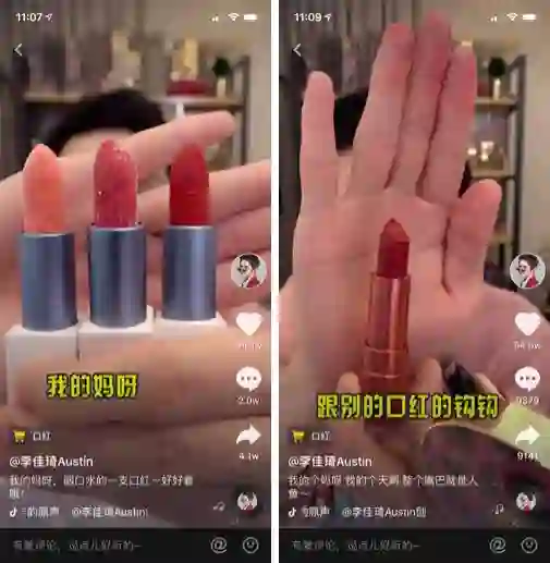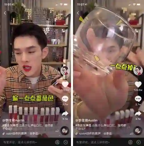 而且,动态的视觉体验,还可以更直接地展示产品效果,增强产品的说服力。在上一节我们也提到了,这是李佳琦口红视频的包装方法之一。
