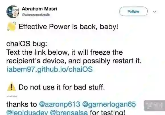 这个问题最早由 Twitter 用户 Abraham Masri 发现,是一个基本的GitHub链接,大家现在将其称之为“chaiOS”。在经过网友和媒体们的测试,已经发现了以下这些可能出现的情况:比如通过信息应用程序发送该链接给他人时,发件人和收件人的信息应用程序会立即冻结和崩溃,想要恢复正常只能够重新获得信息应用线程的访问权限,删除之后在打开。