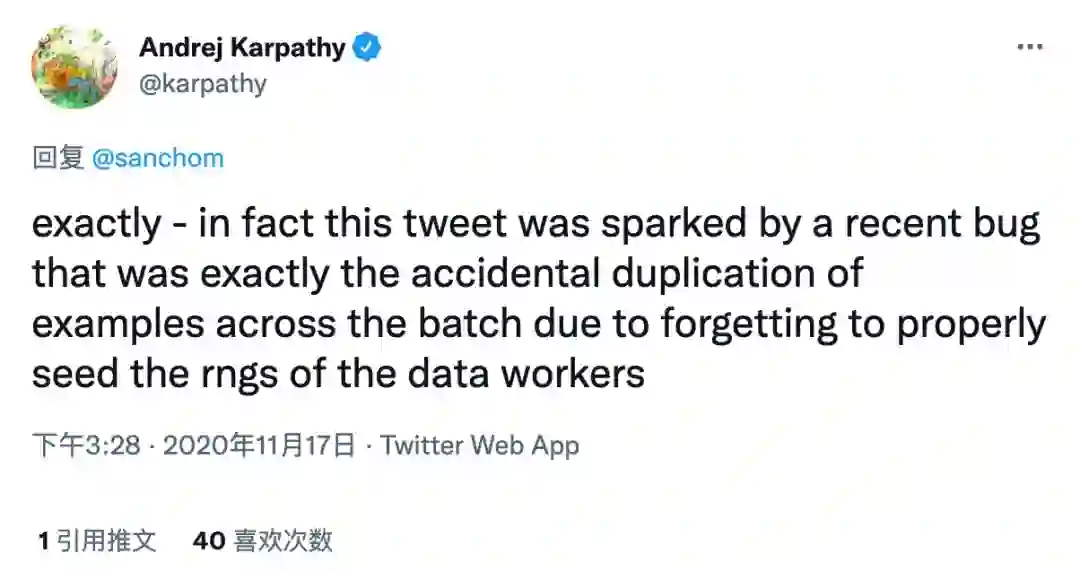 事实上,这条推特是由最近的一个 bug 引发的,该 bug 正是由于忘记正确地为 DataLoader workers 设置随机数种子,而在整个训练过程中意外重复了 batch 数据。