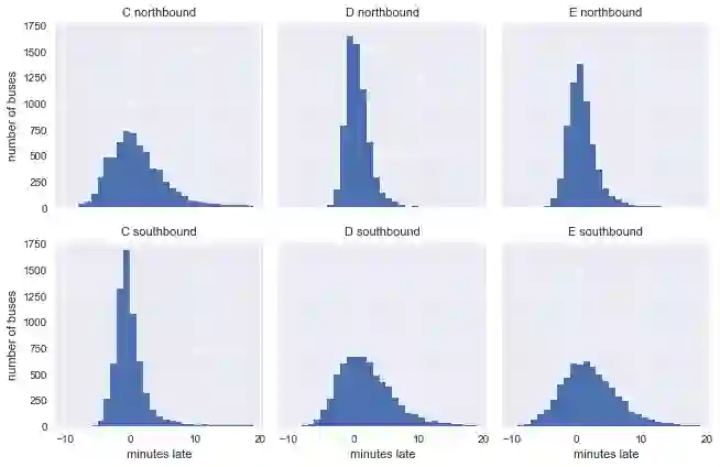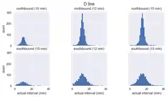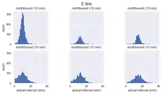 利用这些清理过的数据,我们可以绘制每个公交路线、行驶方向和到站频率的公交车“实际”到站间隔分布:
