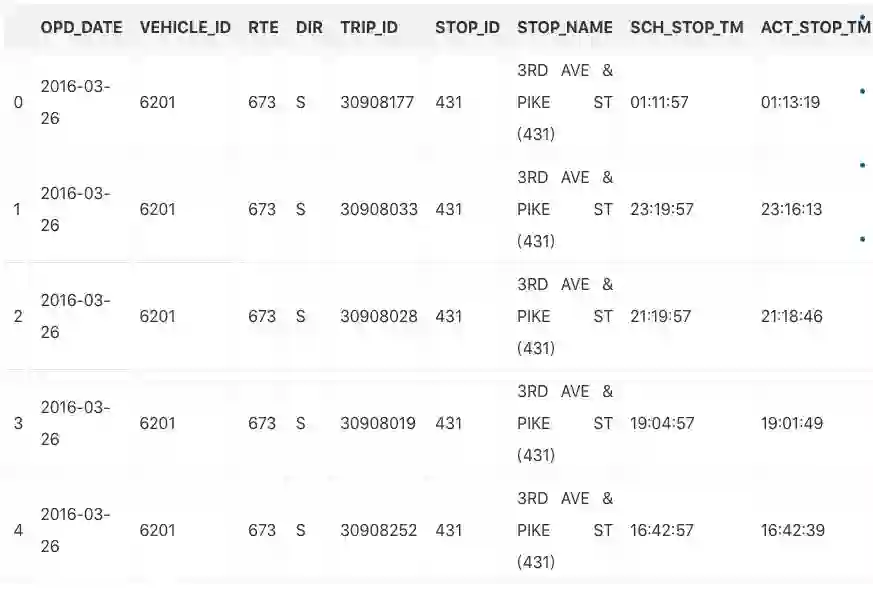 为了探讨等待时间悖论和现实情况是否存在矛盾,我们可以用一些数据进行更深入的研究(arrival_times.csv,3MB CSV文件)。这个数据集包含2016年第二季度美国西雅图3rd & Pike公交站的记录,它一共有3条快速线:C、D和E,给出了每辆公交车的预定和实际到达时间。