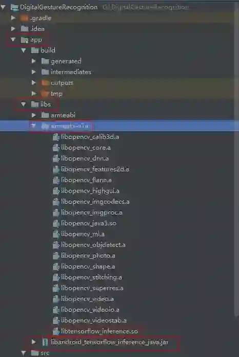 其次,把刚刚下载的 libandroid_tensorflow_inference_java.jar 文件放到 app/libs 目下,把libtensorflow_inference.so 放到 app/libs/armeabi-v7a 目录下,如下图所示: