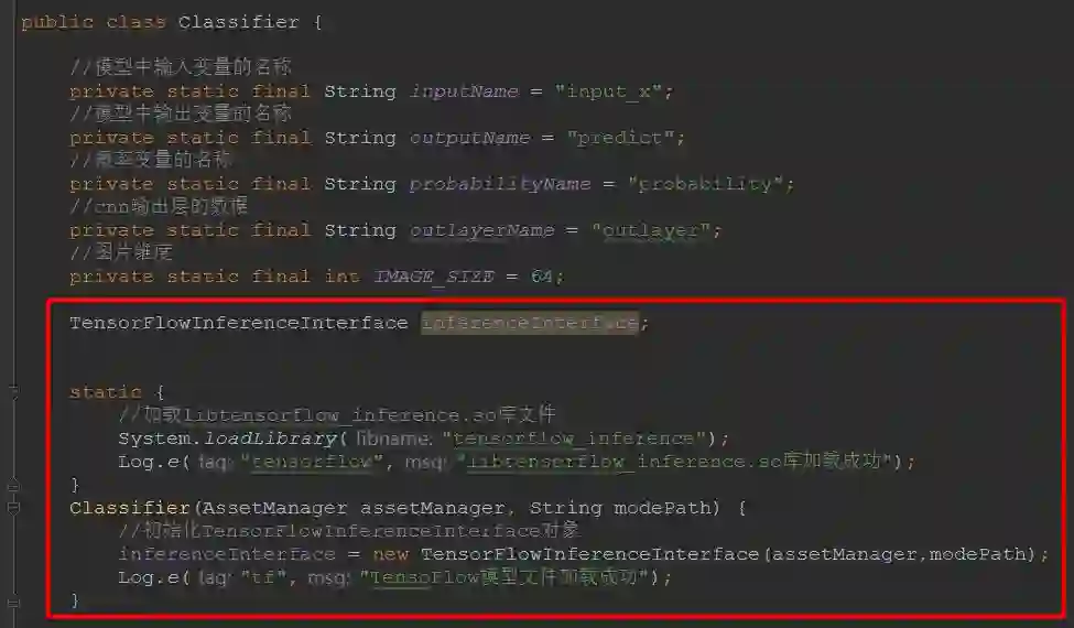 TensorFlowInferenceInterface inferenceInterface; static { //加载libtensorflow_inference.so库文件