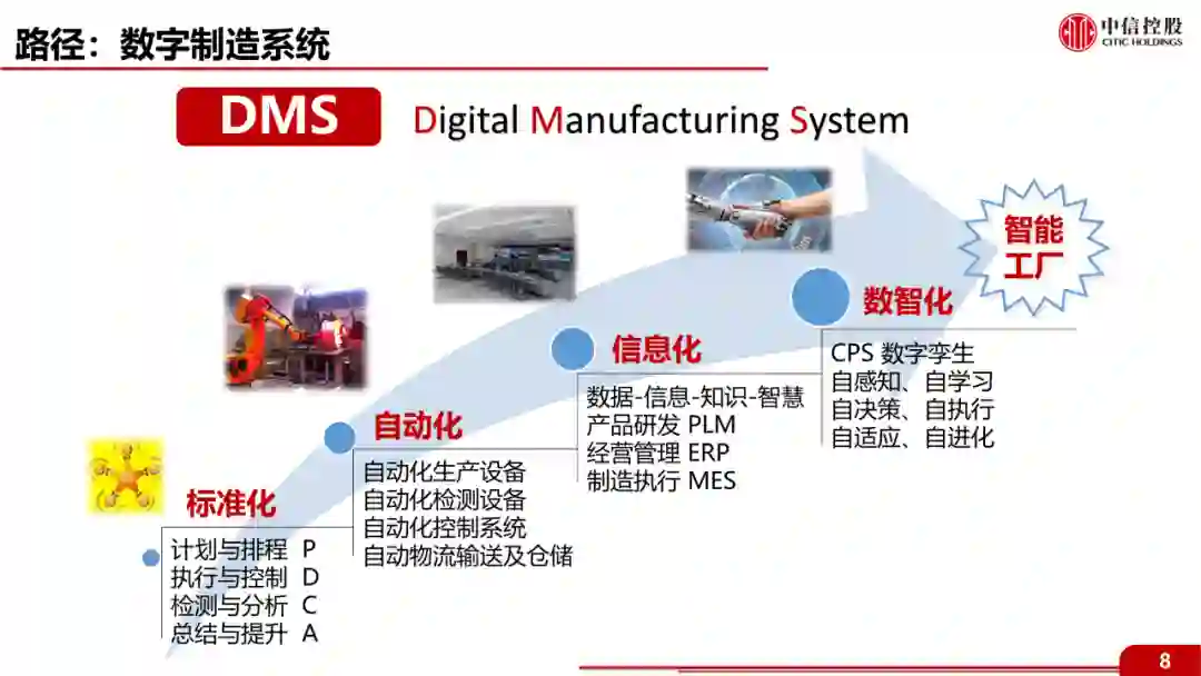 整个系统的目标是要打造数智化的智能工厂,建成工厂的数字孪生(Digital Twin / CPS),能够实现自感知、自学习、自适应、自进化。这套数字制造系统Digital Manufacturing System(简称DMS),并非是一个简单的软件系统,而是融合了管理、硬件和软件等元素的一个数智化制造体系。