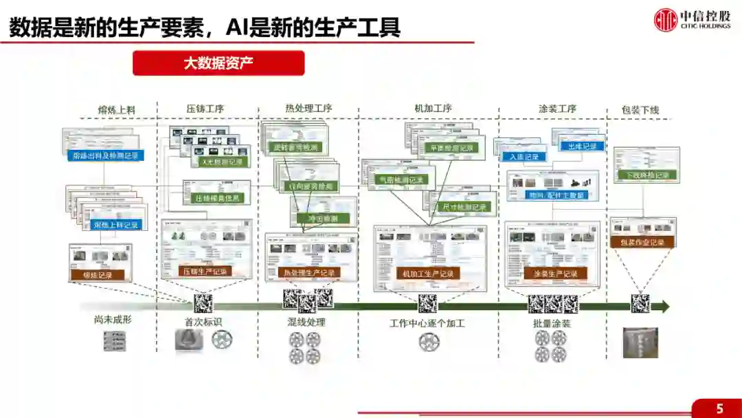 我们后来比较形象把它称作车轮的身份证,每个轮子诞生的时候都获得一个唯一的身份证号,以后的每一个环节都有记录:什么时候在哪个设备上生产的,当时工艺参数是什么,质量检测结果是什么,信息全部被串起来了。这条主轴让海量工业数据真正成为了企业的数据资产而不仅仅是管理成本。