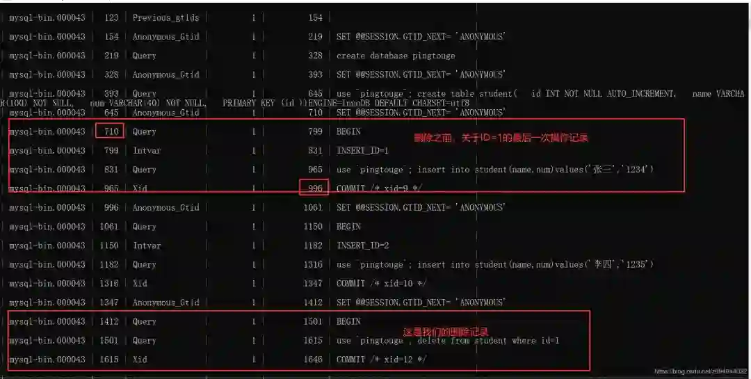 我们在 binlog 日志文件中找到 student 表中 id=1 这条数据在删除之前的最后一次操作的起始偏移量和结束偏移量,在上图中,我已经标出,起始偏移量为:710,结束偏移量为:996。有了这两个参数之后,我们就可以使用 mysqlbinlog 命令来恢复数据了。