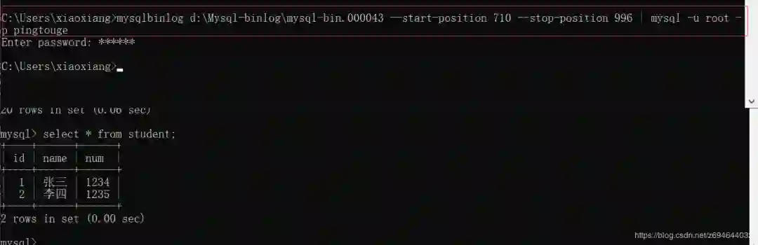 mysqlbinlog d:\Mysql-binlog\mysql-bin.000043 --start-position 710 --stop-position 996 | mysql -u root -p pingtouge;