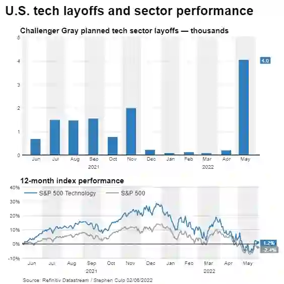 分散组织的做法也引发了人们对 Meta AI 研究未来,甚至整个 AI 领域的担忧。据路透社报道,由于通胀和消费需求减少等因素的影响,今年 5 月美国科技行业的裁员人数超过了今年前四个月的九倍,达到 4044 人。这是自 2020 年 12 月以来的最高月度总数。