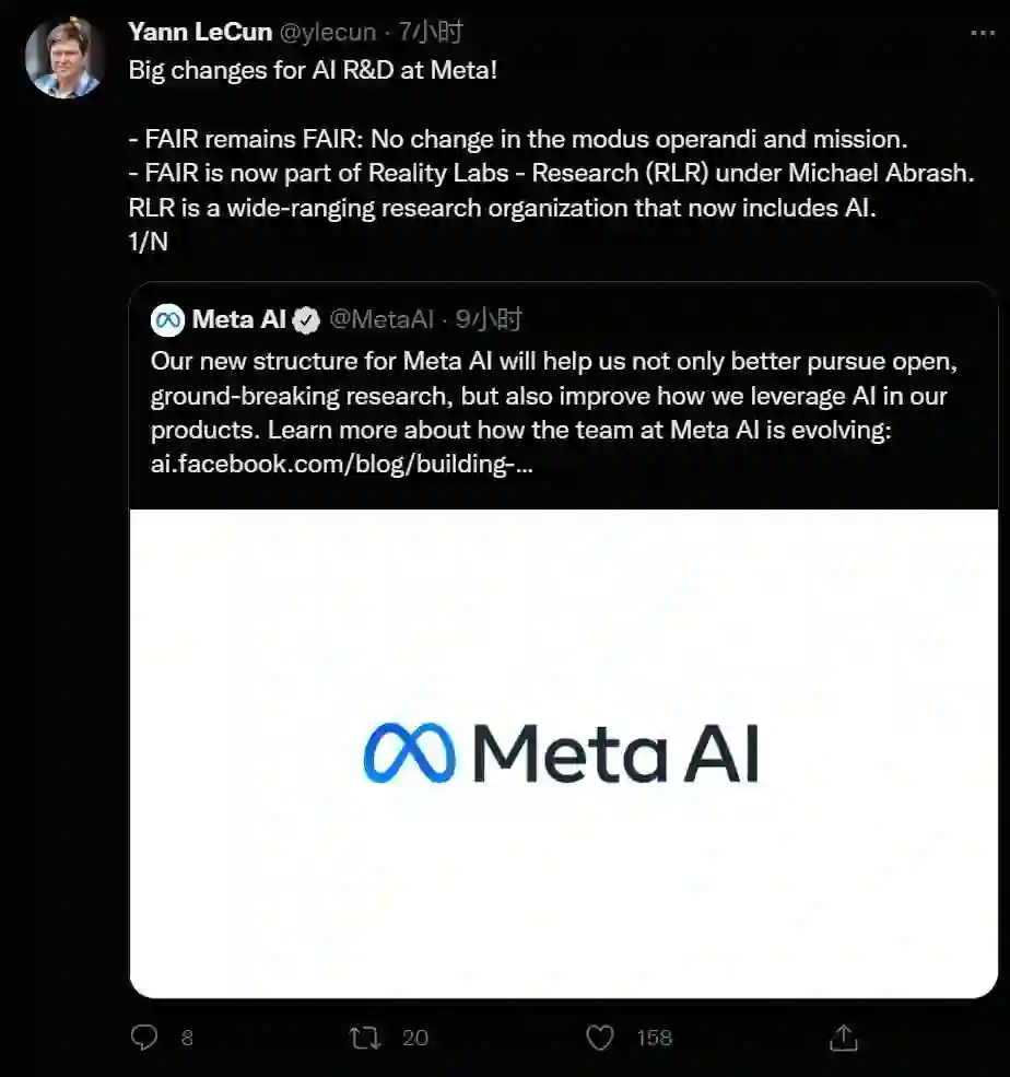 Yann LeCun 一直是 Facebook 人工智能研究的领头人,在公告发布后,他对于 Meta 研究机构的设置进行了进一步解释:「FAIR 的工作方式和使命仍然不变。FAIR 现在是 Michael Abrash 领导下的 Reality Labs - Research (RLR) 的一部分。RLR 是一个范围广泛的研究组织,现在包括人工智能。」