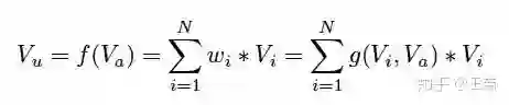 上式中, V_u 是用户的 embedding 向量, V_a 是候选广告商品的 embedding 向量, V_i 是用户 u 的第 i 次行为的 embedding 向量,因为这里用户的行为就是浏览商品或店铺,所以行为的 embedding 的向量就是那次浏览的商品或店铺的 embedding 向量。