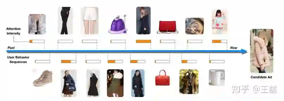但是我们仔细想一想我们自己的购买过程,其实每个用户的兴趣都是多样的,女生喜欢买衣服包包,也喜欢化妆品,甚至还为自己男朋友挑选过球衣球鞋,那么你在买大衣的时候,真的要把给男朋友买球鞋的偏好考虑进来么?具体到本文的例子中,在预测大衣的 CTR 这件事情上,用户浏览过杯子,跟用户浏览过另一件大衣这两个行为的重要程度是一样的吗?
