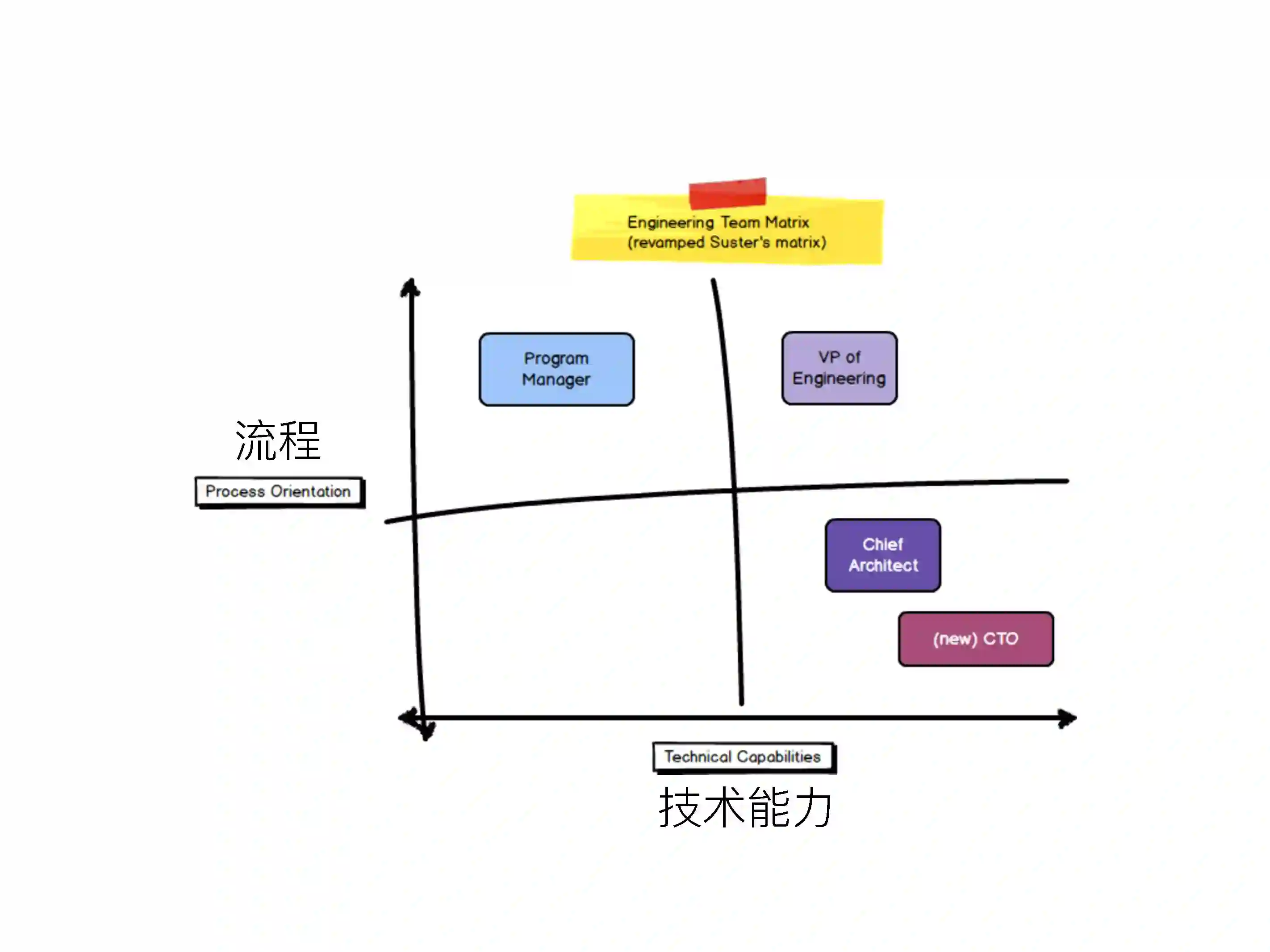 如果用一张图表示,X轴是技术能力,Y轴是流程设计,右下角是CTO,左上是产品经理,右上是技术总监,下面还有架构师。