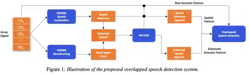 四 前端信号处理技术 1 联合声学特征和空间特征的会议场景混叠语音检测技术 Investigation of Spatial-Acoustic Features for Overlapping Speech Detection in Multiparty Meetings 多人会议场景,存在一个普遍的现象是多人同时说话造成的混叠语音。这种混叠语音的存在对于后续语音增强,语音识别等任务都造成了很大的挑战。本研究我们探索如何有效的检测出多人会议的音频信号中的混叠语音。不同于过往的只利用单通道的音频信号进行混叠语音检测,我们的研究探索了实际录制的8通道语音信号利用信号处理提供的声源空间信息和音频声学信息来联合进行建模进行混叠语音检测。特别的,我们提出了two-stream DFSMN来有效联合建模两种特征,以及提出了一种基于attention的pooling技术来实现句子级的建模。我们在真实录制的会议数据集上进行了实验验证,结果显示联合音频和空间信息的混叠语音检测相比于基线基于音频的检测方法可以获得明显的性能提升。