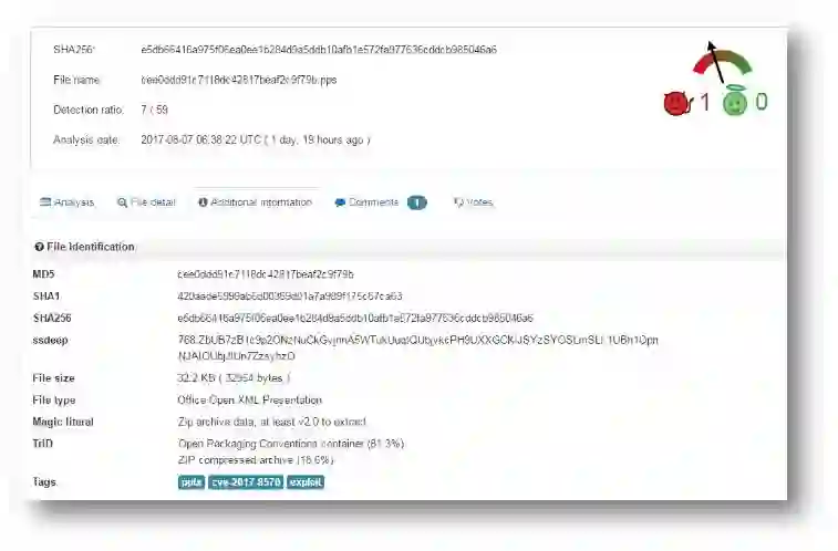 上周360天眼实验室发现了有国外黑客在Github上发布了CVE-2017-8570漏洞的利用代码,但随即删除,以此之后发现了不少标注为CVE-2017-8570的Office恶意样本,比如下面这个VirusTotal上被标记为CVE-2017-8570的样本。