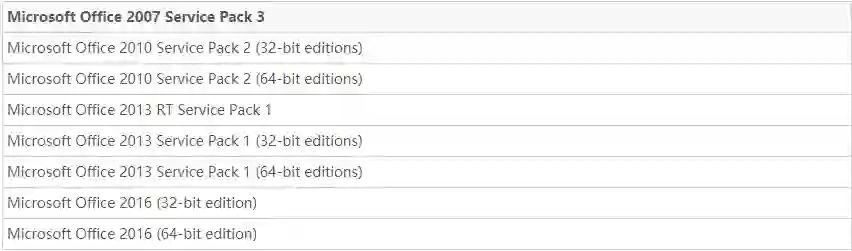 Windows系统补丁大多会被正常安装,但Office的补丁是否能正常安装取决于当前的版本,微软在安全通报中所列的可打补丁的Office版本如下: