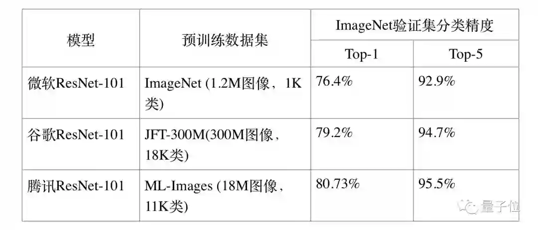 (注:微软ResNet-101模型为非迁移学习模式下训练得到,即1.2M预训练图像为原始数据集ImageNet的图像。)