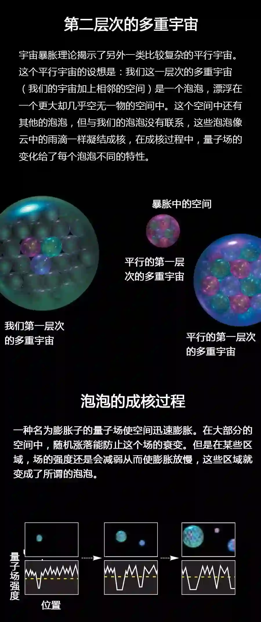这个平行宇宙的设想是:整个空间将永远不停地膨胀下去,但空间的某些区域会停止膨胀,从而形成一个个泡泡,就像发面时,面团里的气泡一样。我们这一层次的多重宇宙(我们的宇宙加上相邻的空间)就是一个泡泡,漂浮在一个更大却几乎空无一物的空间中。这个空间中还有其他的泡泡,但与我们的泡泡没有联系,这些泡泡像云中的雨滴一样凝结成核,在成核过程中,量子场的变化给了每个泡泡不同的特性。