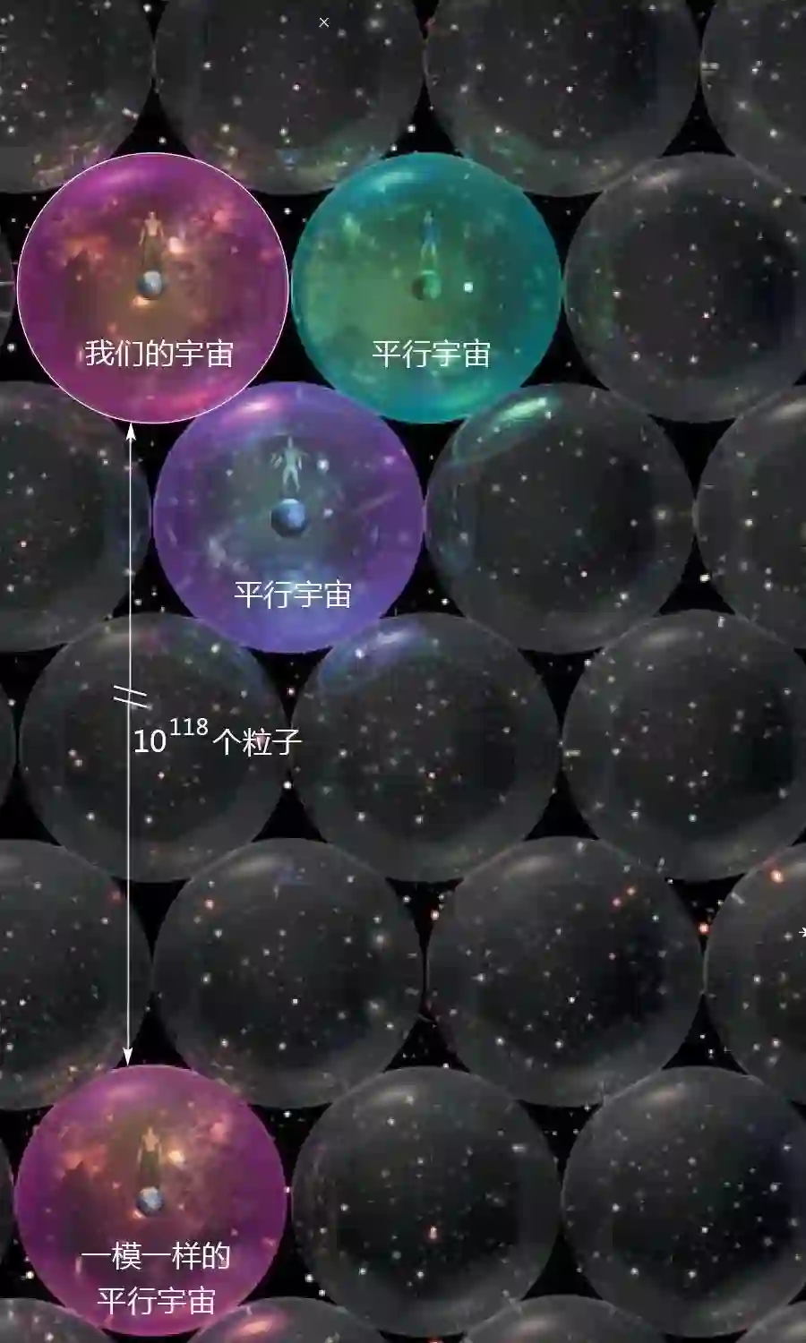 我们首先考虑一个简化的模型。想象有一种二维的小宇宙,它的空间仅能容纳4个粒子。这样的宇宙中,物质共有24即16种可能的排列方式。如果这样的宇宙超过16个,那么它的物质排列方式必定会重复出现。在这个例子中,距离另一个最近宇宙的距离,约为每个宇宙直径的4倍左右。
